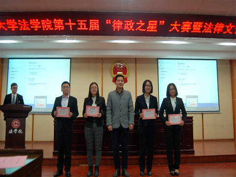 结合初赛成绩和现场表现,比赛最终评选出“律政之星优秀提案奖”等四项奖项。评委老师为参赛选手颁发获奖证书并合影留念。