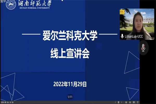 (通讯员 吴桐宇 曾若兰 张娅晴)11月29日晚上,公司在腾讯会议举办爱尔兰科克大学线上宣讲会,本次活动由爱尔兰科克大学上海办事处主任罗乐(Lillian Luo)担任主讲人,党委书记唐建文参加本次活动并担任主持人。