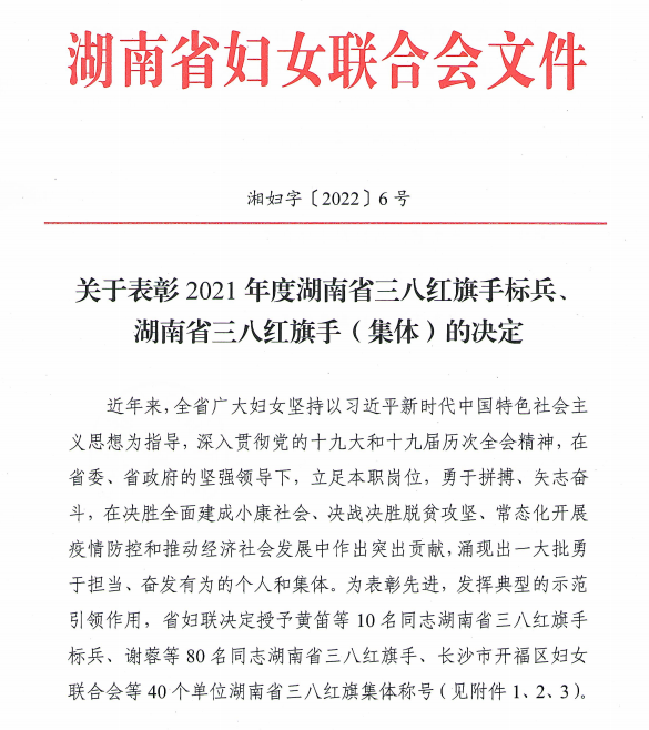 (通讯员 吴欣悦)近日湖南省妇女联合会发布《关于表彰2021年度湖南省三八红旗手标兵、湖南省三八红旗手(集体)的决定》,表彰了我省一批立足本职岗位,勇于拼搏、矢志奋斗的先进个人和集体,公司李爱年老师荣获“湖南省三八红旗手”称号。
