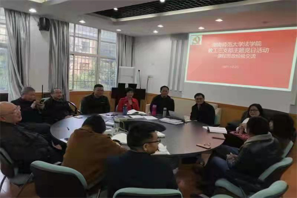 与会党员教师首先学习了教育部颁布的有关课程思政的一系列文件,之后就如何提升教师课程思政建设的意识和能力、如何科学设计课程思政教学体系及如何结合专业特点分类推进课程思政建设等重点问题展开交流。与会教师认为:应该更加自觉地用习近平新时代中国特色社会主义思想武装头脑和指导工作,为顺利开展课程思政做好思想准备和理论贮备。在讨论如何科学设计课程思政教学体系及如何结合专业特点推进课程思政的问题时,欧福永老师介绍了自己将课程思政的要素有机融入《国际私法》教材修订过程的经验;黄捷老师认为应该克服课程思政和专业知识传授两张皮的现象,并结合自己开设的《法律情境实验课》交流了自己的经验;吴智老师认为应该将二者有机结合,达到润物细无声的效果;文同爱老师就如何将习近平总书记“地球生命共同体”理念有机融入《环境法》的教学作了经验介绍;吴彬彬老师认为,课程思政的一个主要目的在于培养同学热爱党、热爱祖国、热爱生活,她就如何从热点案例切入进行课程思政介绍了经验;肖晗老师认为中华民族优秀传统文化也是课程思政的主要内容。黄文旭老师介绍如何将教学辅助软件“雨课堂”引入课堂教学,从而提高员工对嵌入课程思政要素的专业课程的兴趣。