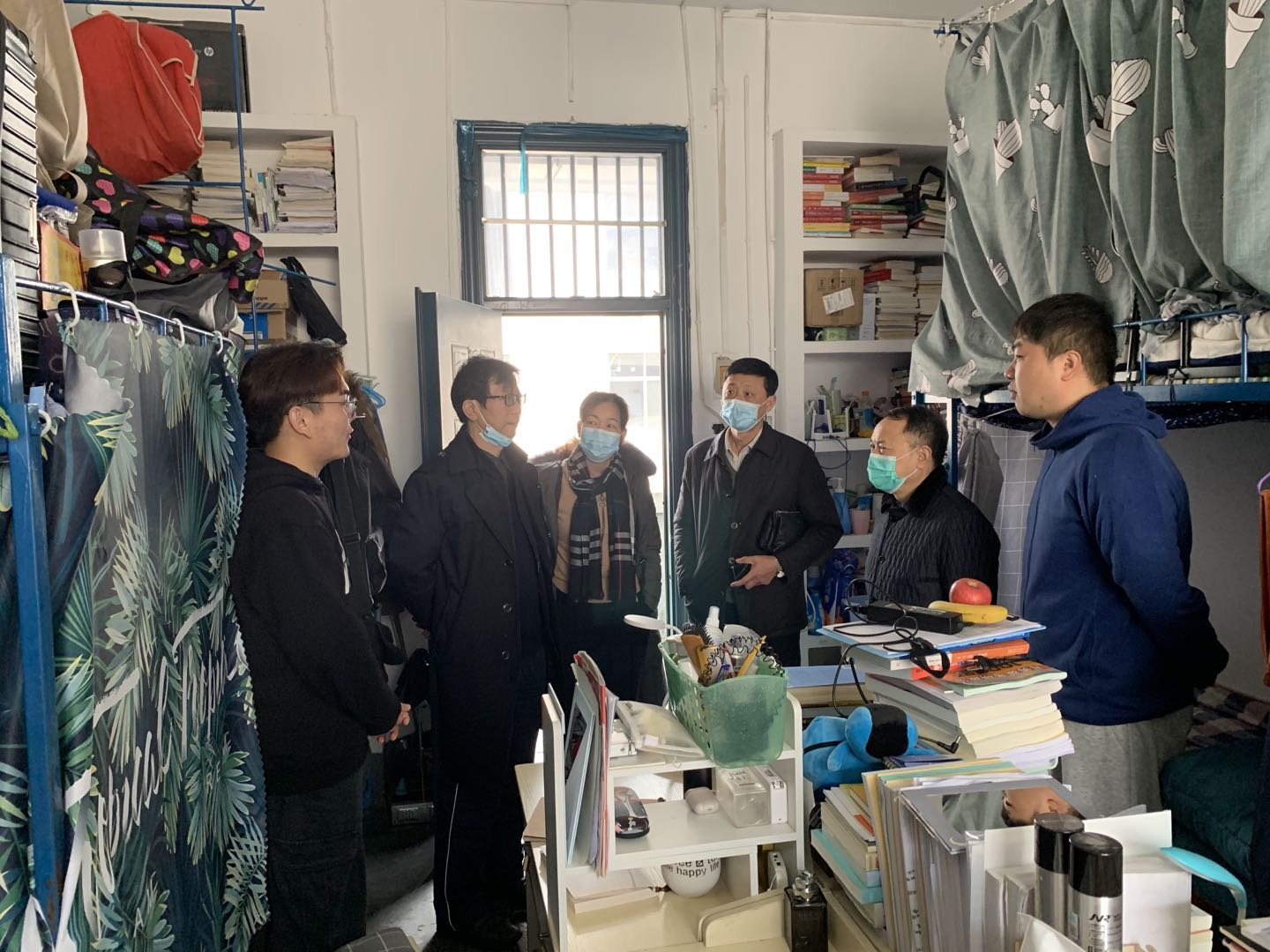 在江边二舍寝室内,两名由于疫情防控要求无法回家过年的同学正收拾寝室卫生,迎接新年,肖北庚一行院领导和老师的到来,给寂静的寝室带来了温暖与热闹。院领导们与两名同学耐心交谈,详细询问了两名同学留校至今的生活情况,并表示有任何问题都要及时向公司领导老师反映,给他们送去了节日慰问和新春祝福,表达了公司领导老师对留校同学的关心关爱。院领导一行还叮嘱留校同学,不仅要提高自我防护意识,继续做好疫情防控,严格遵守公司相关纪律要求,做到日报平安,还要利用假期留校时间安心学习,查漏补缺,度过一个充实而有意义的寒假。第二学位班主任黄谷秀老师还热情邀请两名留校同学到其长沙家中过春节。
