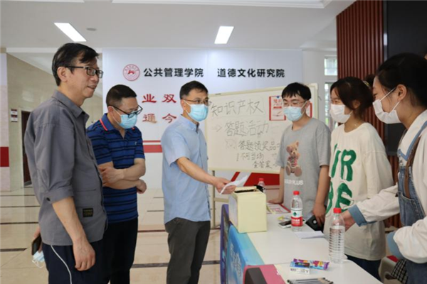 (通讯员 黄三峰 董芳伊 黄洁)4月26日,公司组织20级知识产权班在图书馆、景德楼、木兰路三处设点进行世界知识产权日宣传及趣味知识问答活动。公司党委书记唐建文、正处级组织员陈胜国、知识产权系主任邓建志、学工办主任罗紫薇、团委负责人罗静伟、2020级辅导员周凌月和2021级辅导员许华燕视察并参与了此次活动。
