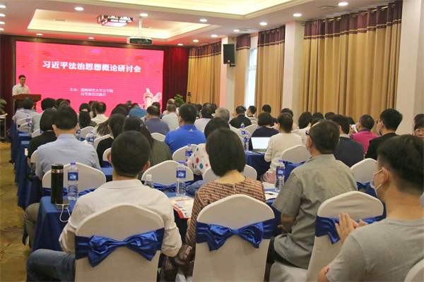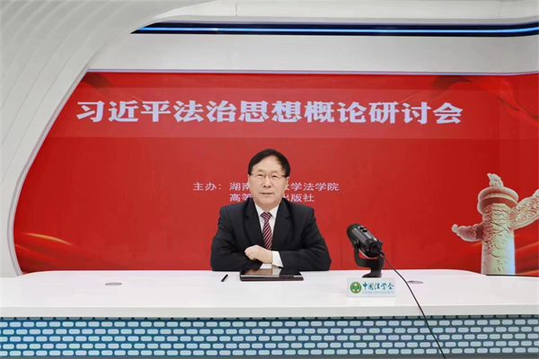 张文显从思想印记、鲜明特色、主要内容、理情结合、研究动态五个方面深刻地阐述了对习近平法治思想教学工作的几点思考。肖北庚以《力行习近平法治思想,创新法治人才培养机制》为题,从全面提升法治人才质量、优化人才培养方案、把握法学学科性质以科学处理知识教学和实践教学的关系三个方面结合习近平法治思想对如何培养法治人才队伍进行详细介绍。随后,彭中礼、蒋海松、欧爱民和宋智敏分别以《<习近平法治思想概论>教学过程中的“三位一体”》《<习近平法治思想概论>教学中的道与术》《习近平法治思想三进的湘大做法》和《湖科法学:“五措并举”推进习近平法治思想入脑入心》作主题报告。