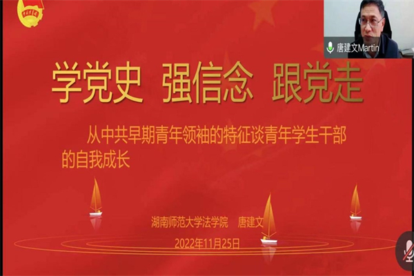 唐建文从中共早期青年领袖的特征、习近平七年知青生活和青年员工干部如何践行担当民族复兴大任的历史使命三方面并联系党的二十大背景展开叙述,为学员们带来了一堂生动的理论课。他向同学们介绍了青年员工运动领袖邓恩铭、王尽美以及陈潭秋的先进事迹,又详细讲述了习近平总书记青年时期在陕西延安的梁家河做知青的工作岁月,最后以一个视频作结,并引用习近平对全国广大青年的寄语勉励学员们要为全面建成社会主义现代化强国贡献青春力量,以实现中华民族伟大复兴为己任。