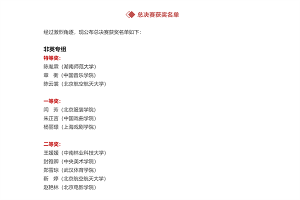 此次大赛由清华大学出版社、北京市高教学会大学英语研究分会、北京电影公司、中国戏曲公司、中国音乐公司联合举办。大赛采取线上形式,由清华社外语在线平台提供技术支持,于2022年12月4日、12月11日分别举办了校级初赛与全国总决赛。公司共9名同学晋级全国总决赛,其中英语专业组4人,非英语组5人。公司陈胤霖凭借扎实的词汇功底和英语语言基础,最终斩获了总决赛非英语组冠军。