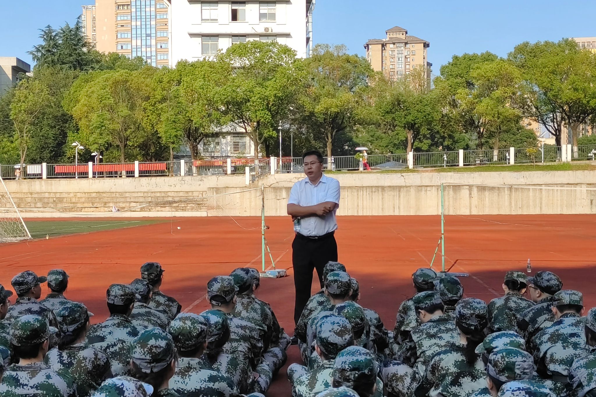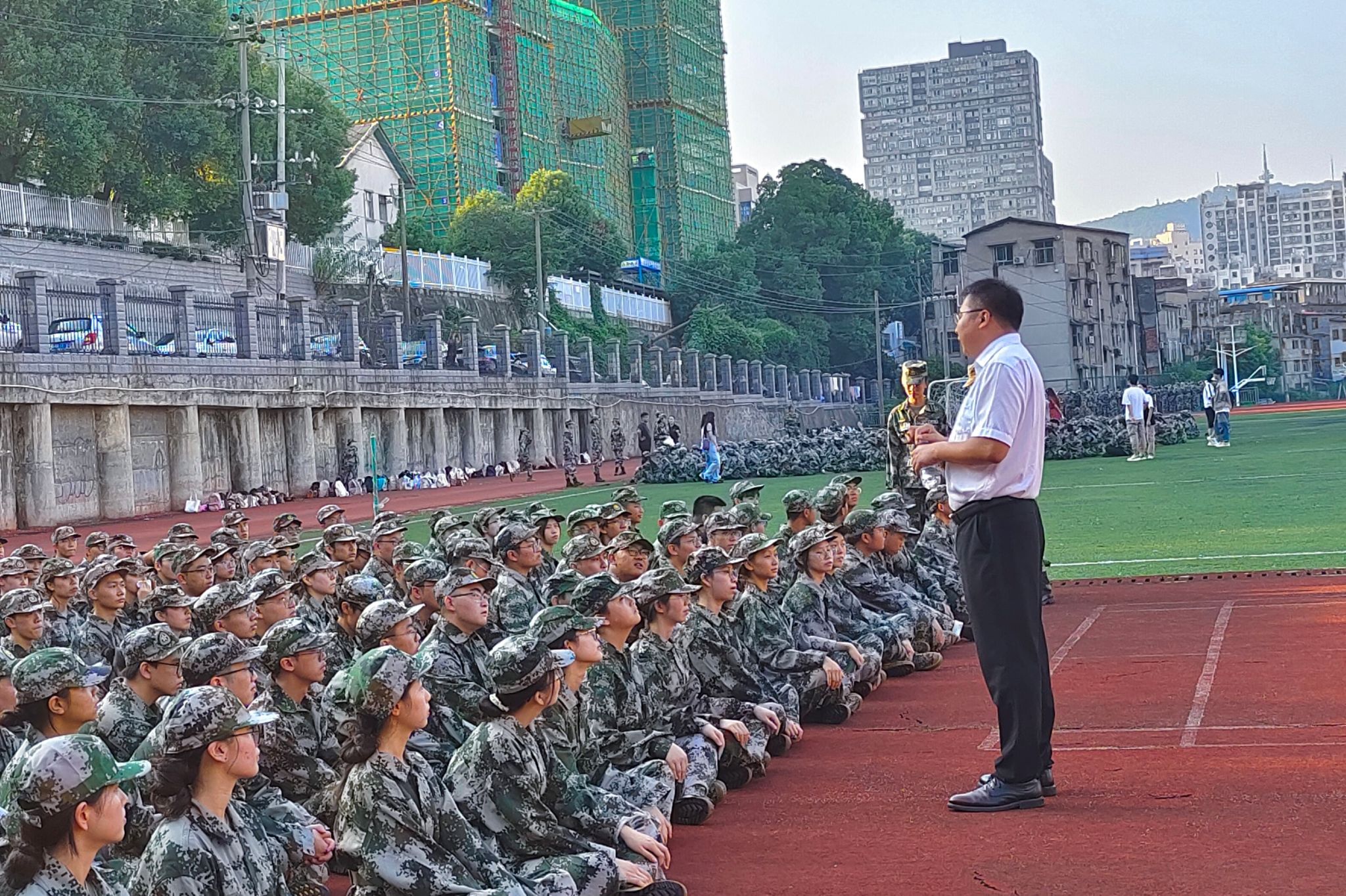 对于接下来的军训生活,曹俊峰向同学们强调了以下三点:一是要培养吃苦耐劳精神,养成刻苦钻研的品质,以昂扬的斗志面临接下来的学习与生活;二是要加强团结协作,共同营造出一个温暖、有爱、充满正能量的集体氛围;三是要不停追求优秀与卓越,让优秀成为一种习惯。曹俊峰对2023级全体本科新生军训风貌进行鼓励,希望同学们戒骄戒躁,以饱满的精神投入到老员工活。