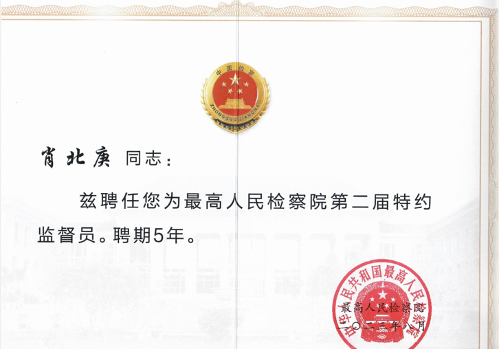 (通讯员 刘力 罗雅萱)近日,最高人民检察院举行特约监督员座谈会,最高人民检察公司党组书记、检察长应勇出席会议并为第二届特约监督员颁发聘书。全国人大常委会代表工作委员会副主任傅文杰到会指导。最高检党组副书记、常务副检察长童建明主持会议。会上,肖北庚教授被聘为最高人民检察院特约监督员。