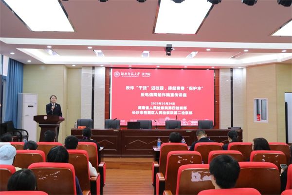 (通讯员 胡康文 陈希亚)10月26日下午,反诈“干货”进校园,撑起青春“保护伞”主题讲座在公司景德楼南栋4楼多功能报告厅举办。湖南省人民检察院第四检察部、副主任李清、张俐、正处级干部曹思益、二级检察官助理谢小元、书记员龙文珍、长沙市岳麓区人民检察院第二检察部主任肖彬、检察官助理曹丹、娄底市人民检察院第三检察部副主任唐燕来校开展宣讲,公司党委副书记曹俊峰及22级辅导员廖星出席。此次讲座由公司23级辅导员张宁莎主持。