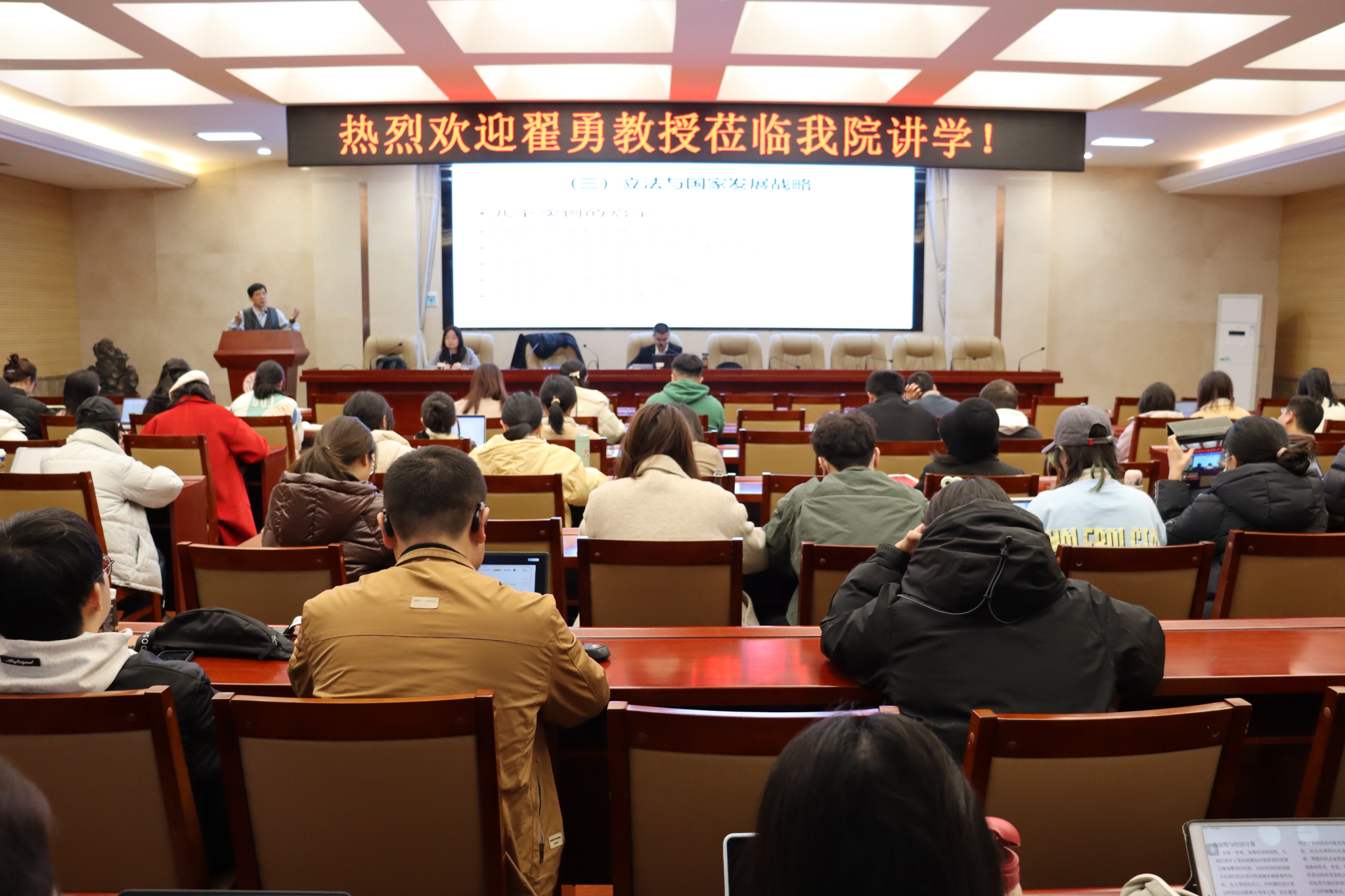 讲座现场气氛热烈,同学们纷纷提出自己的问题,翟勇耐心解答。钭晓东对报告进行了总结,表示讲课内容源于国家立法实践,重点讨论了六个方面的关系,即法条和国情、立法和利益分配、规范主义和科学技术、立法与时间、规范与空间、规范与系统之间的关系。最后,王彬辉表示讲座就立法技术规范作了深刻阐述和分析,并代表公司对于翟勇、钭晓东教授的到来表示感谢。讲座在热烈的掌声中圆满结束。