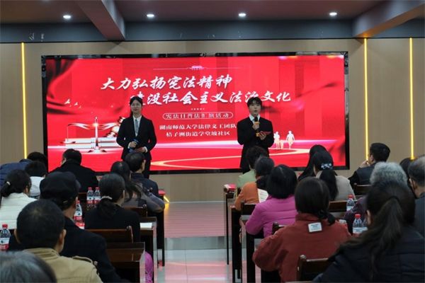 (通讯员 范雨萱 柒银娟 胡康文)为庆祝第十个国家宪法日的到来,12月4日下午,公司法律义工团队联合桔子洲街道学堂坡社区,在学堂坡社区公共服务中心报告厅开展主题为“大力弘扬宪法精神,建设社会主义法治文化”宪法日普法汇演专场活动。公司党委书记唐建文、党委副书记曹俊峰,学堂坡社区党总支书记余海艳、学堂坡社区法律顾问成敏,学工办老师廖星与张宁莎出席此次活动。活动由法律义工团队成员肖志远和贺子洛主持。