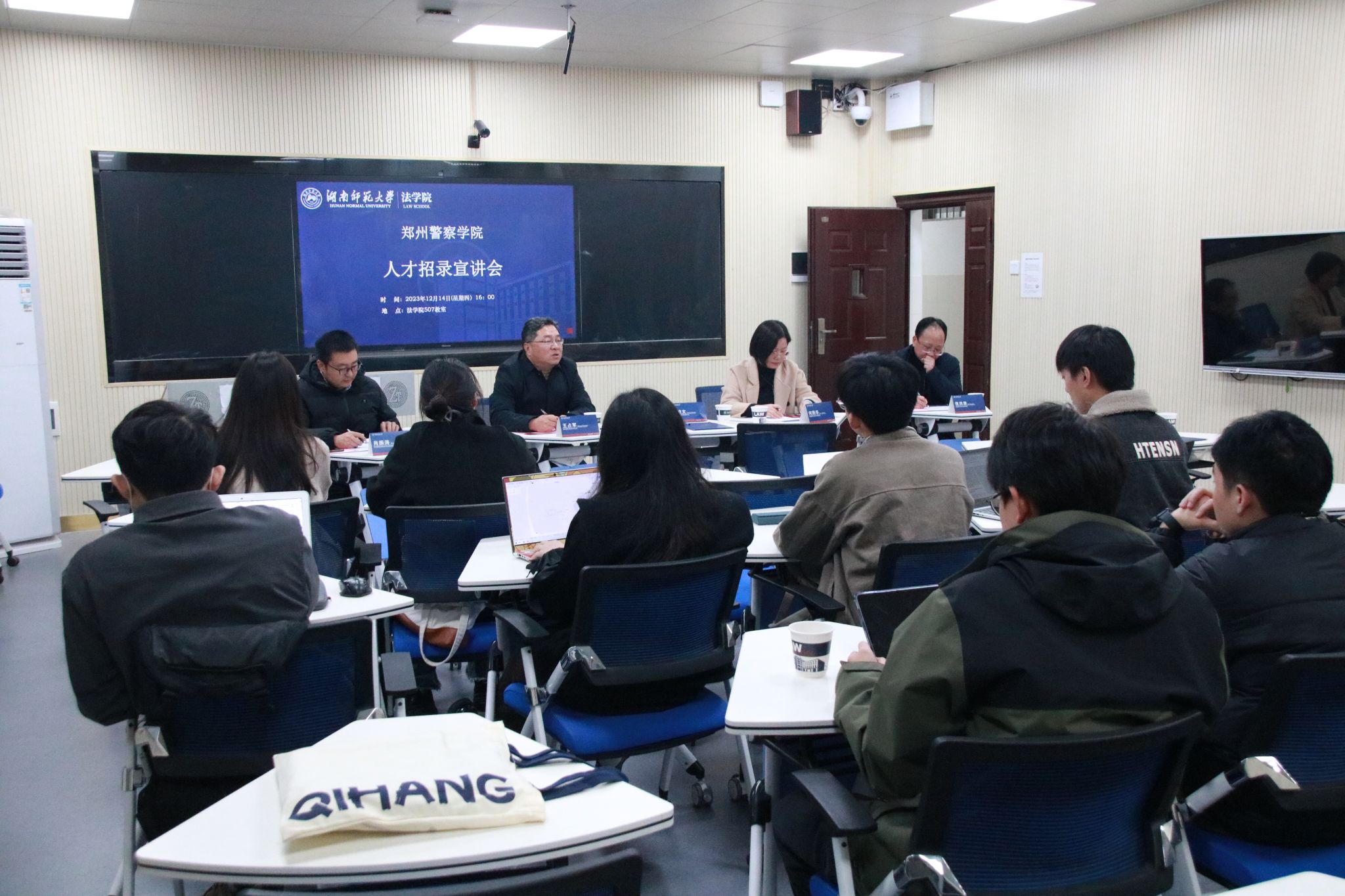 (通讯员 成雨霏 蒋林香)2023年12月14日下午,郑州警察公司人才招录宣讲会在公司507教室举行。郑州警察公司法学系主任王占军,治安系治安基础教研室主任肖振涛,公司副经理何燕华,教授倪洪涛,法硕办负责人罗昊出席此次宣讲会。宣讲会开始前,公司党委书记唐建文与来宾进行亲切会谈。会议由公司副经理何燕华主持。
