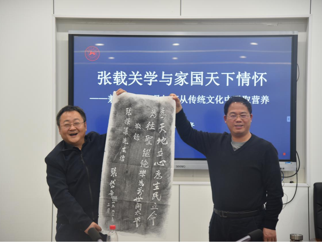 座谈临近尾声之时,魏冬教授将张岱年先生在横渠书院手书的“横渠四为句”拓片赠与公司,欧福永副经理代表公司感谢并合影留念。