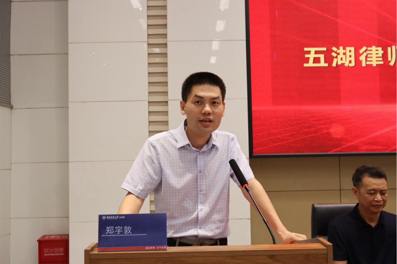 湖南五湖律师事务所主任郑宇敦作为优秀员工代表发言。他首先分享了自身在校求学的故事,对母校和恩师表达了感激之情,随后又结合自己的律师职业成长历程,为同学们的老员工活和职业规划提供了具体可行的建议。
