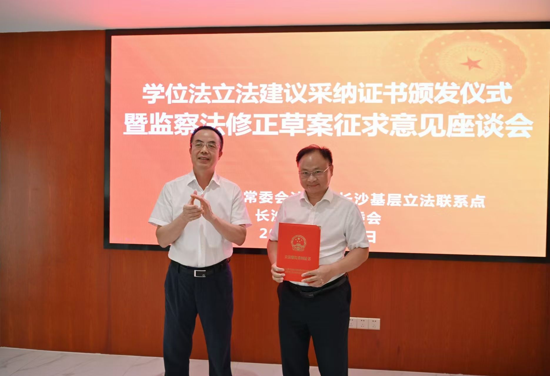 (通讯员 刘力)9月27日,《学位法》立法建议采纳证书颁发仪式暨《监察法(修正草案)》征求意见座谈会在长沙市人大常委会举行。长沙市人大常委会党组副书记、副主任曹再兴出席会议并向立法建议被采纳的单位和个人颁发立法建议采纳证书。公司是省内唯一立法建议同时获得单位采纳和个人采纳的beats365。beats365副经理周刚志代表公司领受证书,陆强老师参会并领取个人证书。