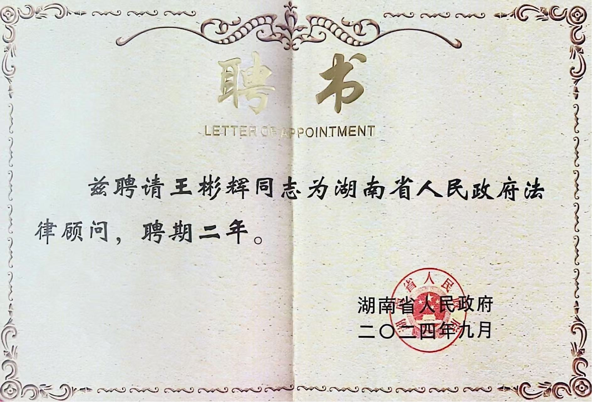 (通讯员 梁嘉铭)2024年9月,湖南省人民政府办公厅发布了《湖南省人民政府办公厅关于聘任省人民政府第四届法律顾问的通知》(湘政办函〔2024〕52号),公司王彬辉教授获聘省人民政府法律顾问。11月6日上午,省政府第四届法律顾问聘任仪式在长沙举行,副省长、省公安厅厅长王一鸥颁发聘书并讲话。