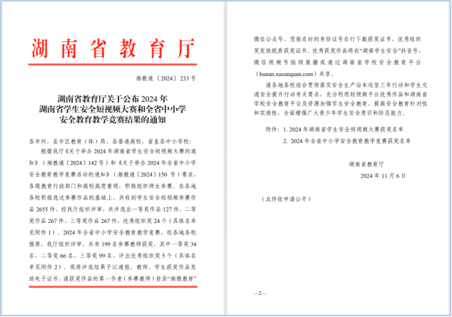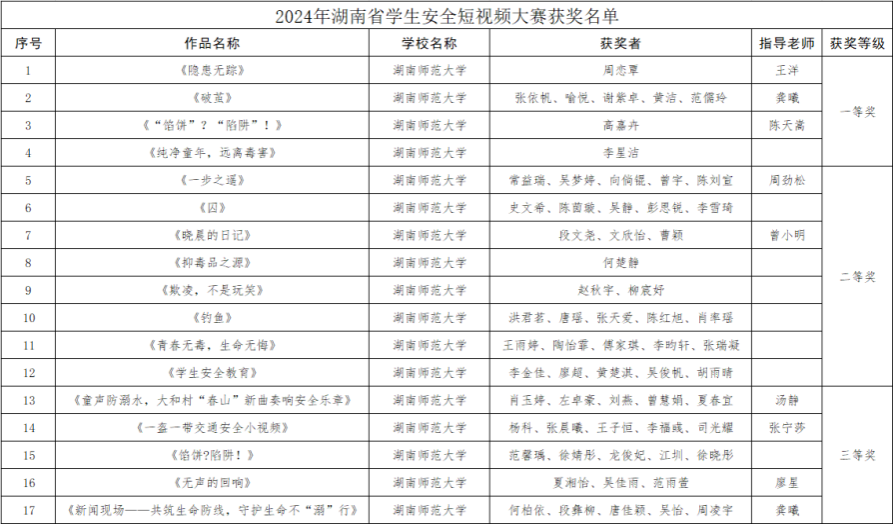 (通讯员 江杨续东 李雯燕 胡康文)近日,2024年湖南省员工安全视频大赛获奖名单正式揭晓。公司在本次大赛中共有17件作品获奖,其中公司学子的作品《青春无悔,生命无悔》获二等奖,《一盔一带安全小视频》《无声的回响》分别获三等奖。