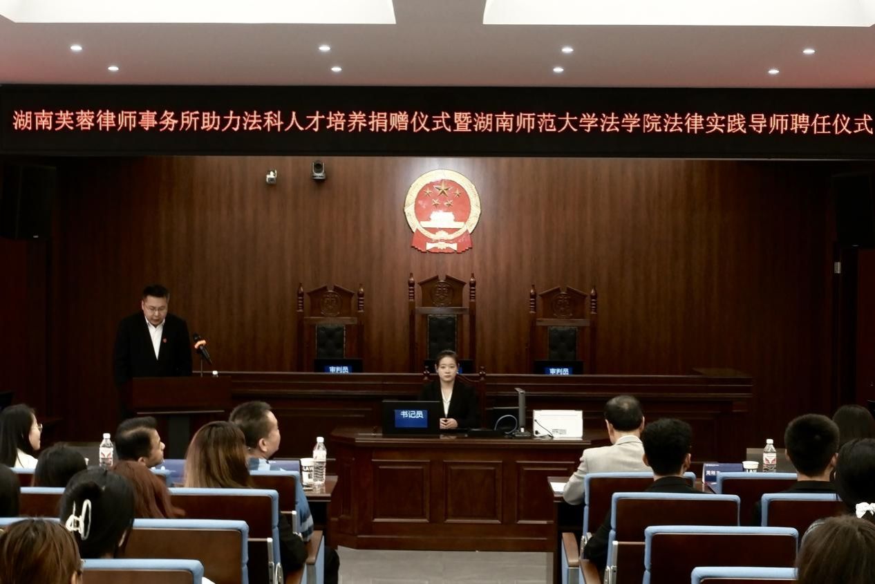 (通讯员 宋玫璟 李奕瓯 宋垚)11月14日下午,公司在景德楼南栋模拟法庭举行湖南芙蓉律师事务所助力法科人才培养捐赠仪式暨beats365“法律实践导师”聘任仪式。湖南芙蓉律师事务所主任陈平凡,律所董事、高级合伙人余希律师、杜颖律师,高级合伙人葛亚平律师,律所雷胜兵律师,刘方桥律师,行政工作人员施湘,潘敏,贾丽阳受邀出席仪式。公司党委书记唐建文,副经理周刚志、何燕华,公司党委委员、博导王彬辉教授,博士生导师黄捷教授,院研究生办公室主任王丹,院团委负责人廖星参加活动。公司党委副书记曹俊峰担任主持人。