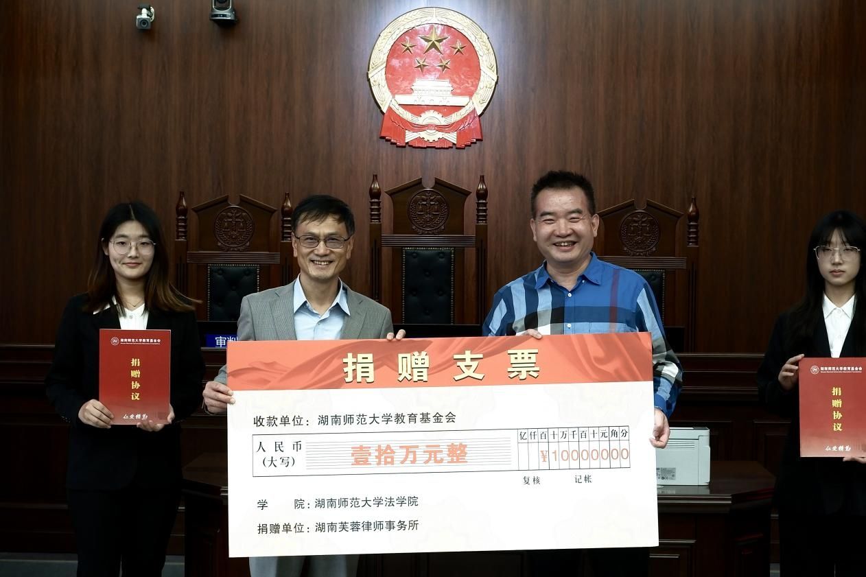 在现场捐赠仪式环节,唐建文与陈平凡交接并展示捐赠款项。湖南芙蓉律师事务所向公司慷慨捐赠10万元,用于支持湖南省老员工法律检索大赛等学科专业竞赛活动,不断丰富专业实践内容,为同学们提供更加多样化、更高层次的学习锻炼和实践平台。