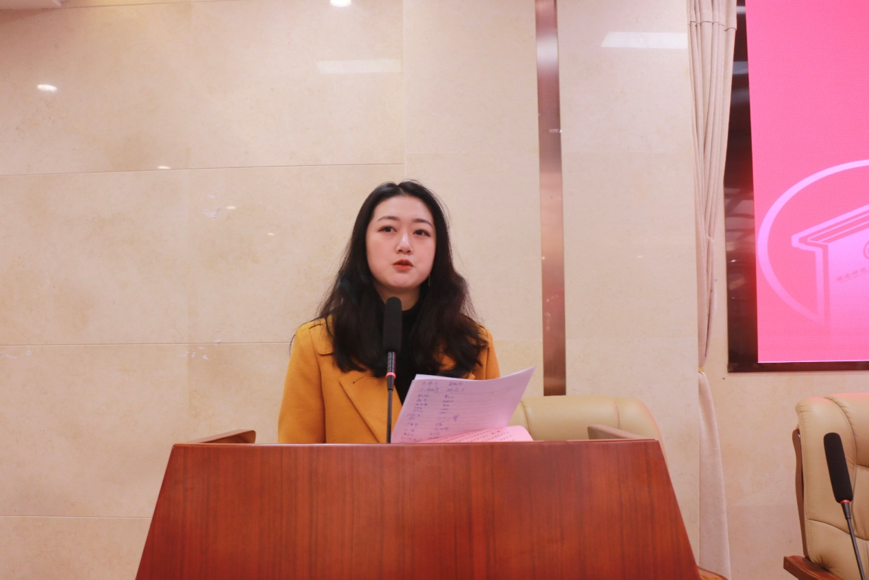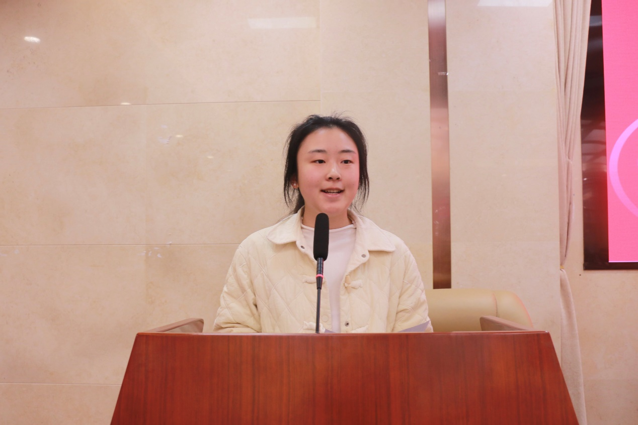 研究生代表肖扉予发言。肖扉予结合自身跨专业考研和入党的学习经历,讲述了逐渐认识宪法、了解宪法的过程。她表示法员工应始终坚持宪法精神,秉持法治理念,维护社会公平正义;要始终坚持以宪法为准则,以法律为武器,为人民的合法权益保驾护航。