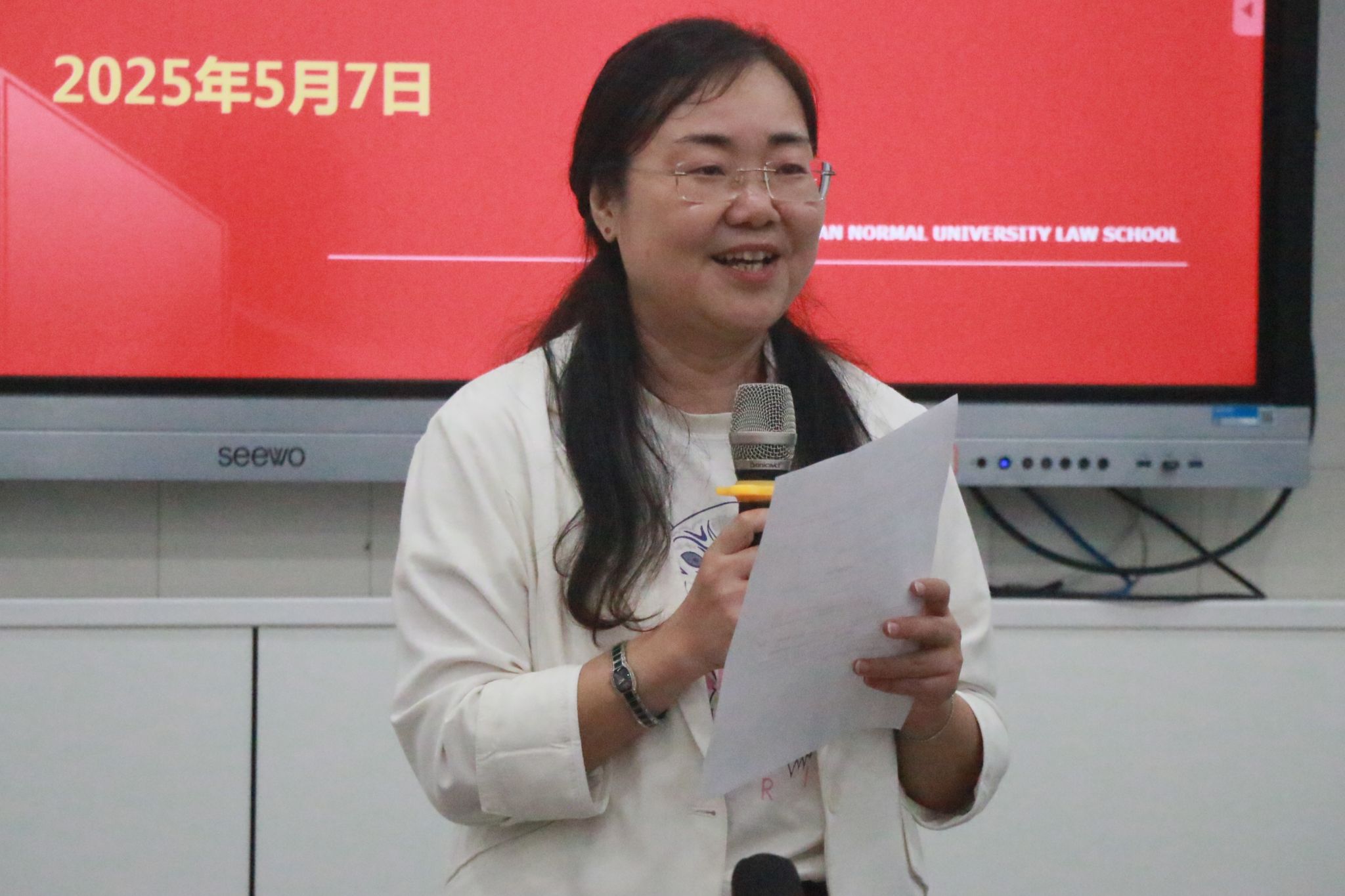 带队教师代表刘湘琛发言。她谈到法科生应具备记忆能力、术语转化能力,以及通过实习和实践培养剖析问题能力和理论与现实结合能力。此外,刘湘琛结合实例讲述了实习生们在实习中的成熟与进步,说明了实习经历对增强责任感、明确职业方向的重要意义。