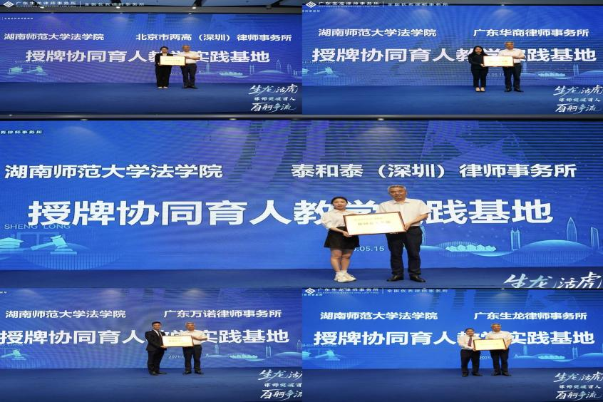 5月15日下午,杜继军一行出席“百人律所授牌仪式暨律产研融合发展峰会”,向广东生龙律师事务所等5家律所授予“协同育人基地”牌匾。