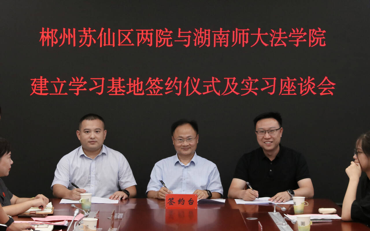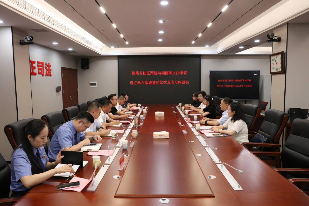 (通讯员 卜湘蓉 韩蕴恬)8月15日,在郴州市苏仙区政法委的大力支持下,公司和郴州市苏仙区人民法院、郴州市苏仙区人民检察院建立实习基地的签约仪式及实习座谈会在郴州市苏仙区人民法院举行。郴州市苏仙区委常委、政法委吕银俊,公司副经理周刚志,郴州市苏仙区人民法公司党组书记及经理谢末钢,郴州市苏仙区人民检察公司党组书记及检察长喻超,公司教务办主任阎英,苏仙区人民法公司党组成员及政治部主任李艳,苏仙区人民检察公司党组成员及政治部主任刘力以及相关科室负责人参与此次签约仪式及座谈会。会议由苏仙区委政法委副书记何飞主持。