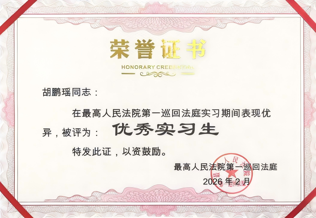 (通讯员 谢英达)近日,从最高人民法院第一巡回法庭传来喜讯:在最新一批法律实习生考核中,公司2023级国际法专业硕士研究生胡鹏瑶凭借扎实的专业功底、严谨的工作作风和出色的综合表现,从众多实习生中脱颖而出,获评“优秀实习生”荣誉称号。