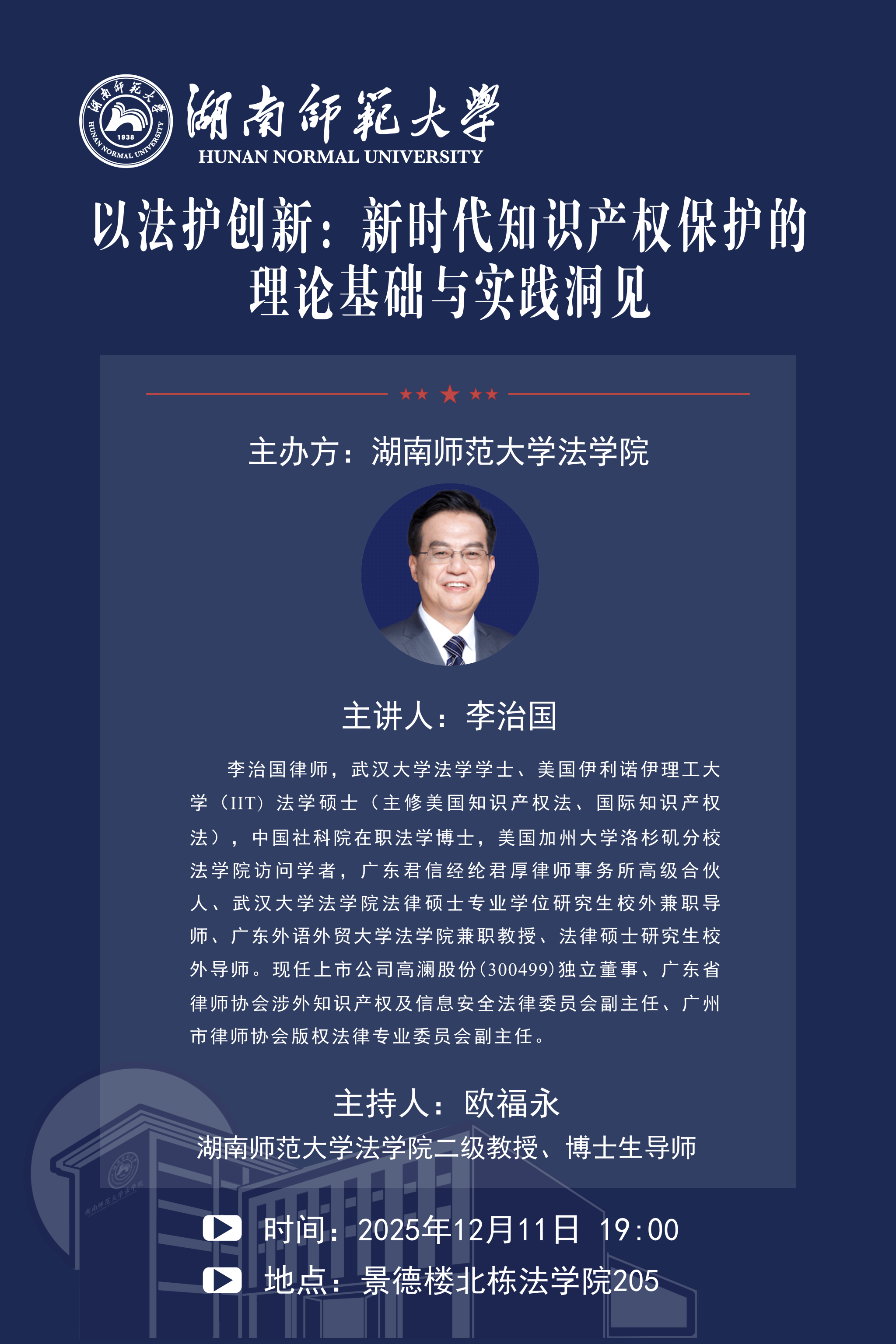 讲座主题:以法护创新:新时代知识产权保护的理论基础与实践洞见