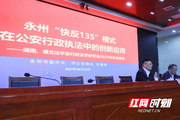 红网时刻新闻10月22日讯10月21日,湖南省·湖北省法学行政法学研究会2023年年会在湖南科技大学举行,本次年会主要围绕“数字法治政府建设”主题进行研讨。永州市政府副市长、市公安局长车丽华受邀参会,并作题为《把握“四性”要求 打造快反模式全面提升公安行政执法能力——永州“快反135”模式在公安行政执法中的创新应用》的主题报告。会上,还播放了永州“快反135”模式宣传汇报片及中央电视台新闻频道采编报道的永州“快反135”APP平台闻警而动,2小时成功解救即将被骗至缅北的六名外省人员新闻。