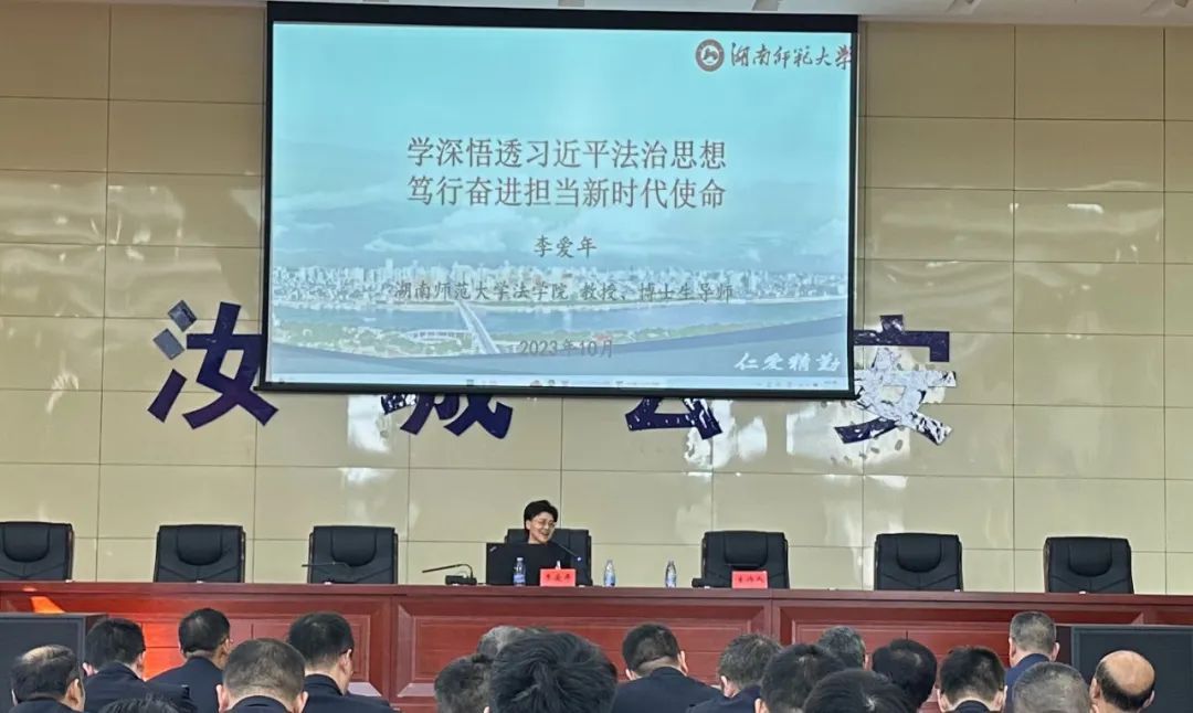 近期,2023年“百名法学家百场报告会”法治宣讲专场报告会在汝城县举行。beats365法理学硕士和哲学博士、中国社会科公司法学所环境与资源法学博士后、beats365二级教授、博士生导师李爱年教授应邀到场作题为《学深悟透习近平法治思想,笃行奋进担当新时代使命》专题报告,全县政法系统450余人听取了讲座。县委政法委常务副书记何小青主持会议。
