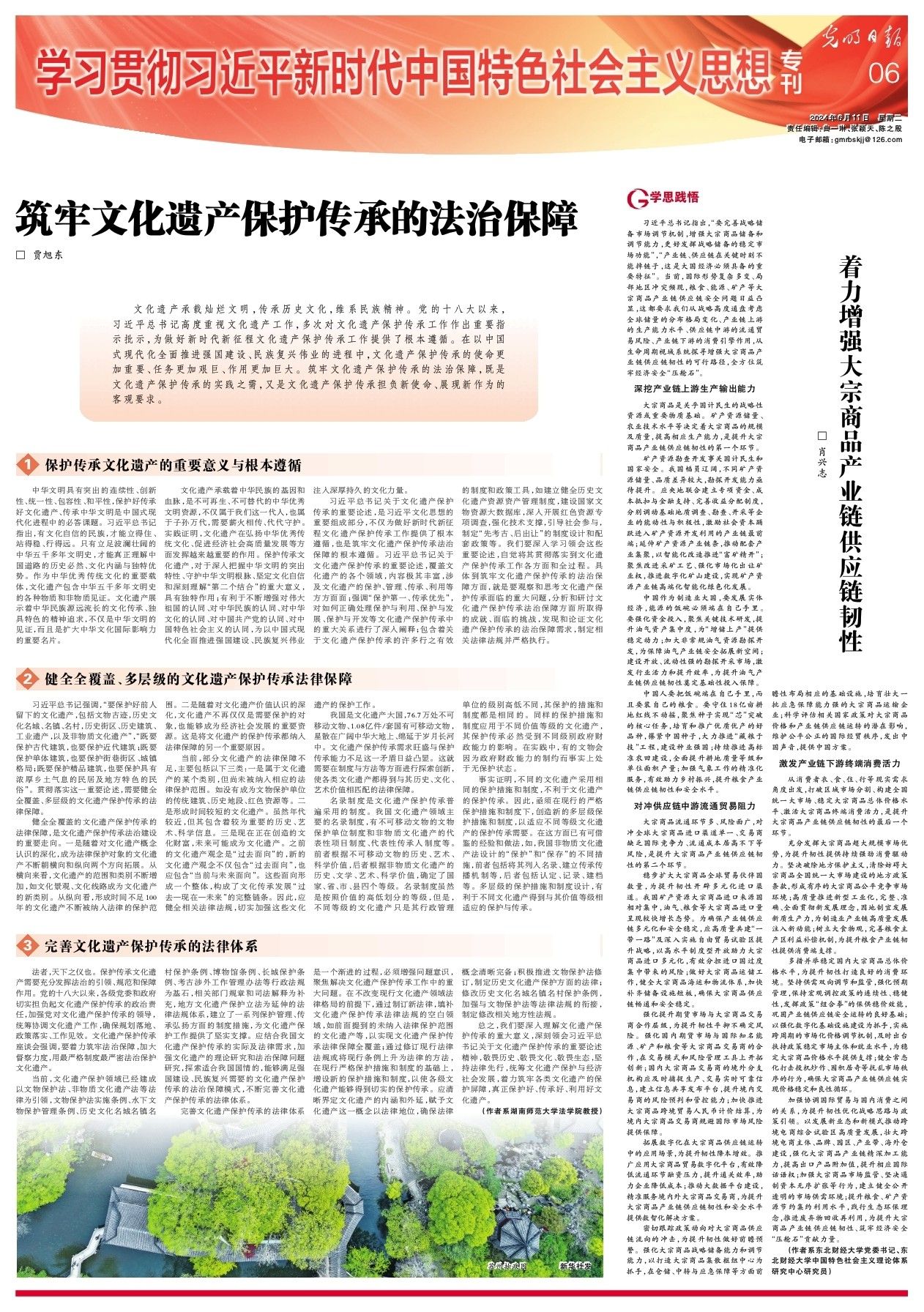 习近平总书记强调,“要保护好前人留下的文化遗产,包括文物古迹,历史文化名城、名镇、名村,历史街区、历史建筑、工业遗产,以及非物质文化遗产”,“既要保护古代建筑,也要保护近代建筑;既要保护单体建筑,也要保护街巷街区、城镇格局;既要保护精品建筑,也要保护具有浓厚乡土气息的民居及地方特色的民俗”。贯彻落实这一重要论述,需要健全全覆盖、多层级的文化遗产保护传承的法律保障。