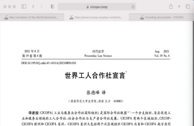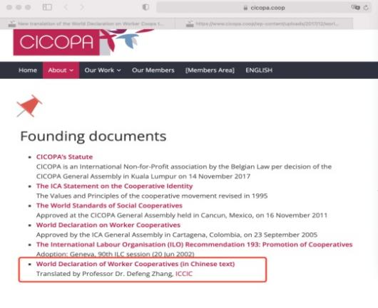同时,CICOPA官网采用英语、法语和西班牙语三种语言以《加深中国理解<世界工人合作社宣言>的新译本》为题对该中译本进行了报道,其中文翻译如下: