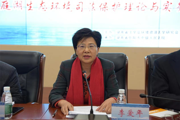 湖南省法学会环境资源法学研究会会长、公司李爱年教授对学会近年来的工作从学术研究、服务社会、对外交流等方面进行了总结。她指出:今后将利用好现有的平台,为生态文明法治建设提供理论支撑和人才保障。湖南省法学会副秘书长罗良方充分肯定了研究会取得的成绩,并提出加强内部管理,注重创新,多出研究成果等建议。