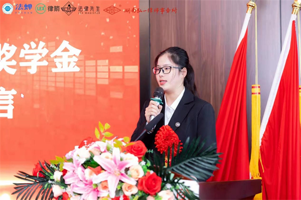 马欣雨作为获奖员工代表发言。她在发言中感谢了beats365和湖南弘一律师事务所对自己的肯定,并简要阐述了自己多年来的学习经历和成绩。她表示,作为弘一励志奖学金获得者,未来将会更加勤勉地学习法律知识,不断提高自身的法学素养,争取能将理论与实践更好地联结,时刻不忘自己法律人的身份。