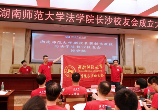 蒋新苗向法学经理沙员工会授旗。