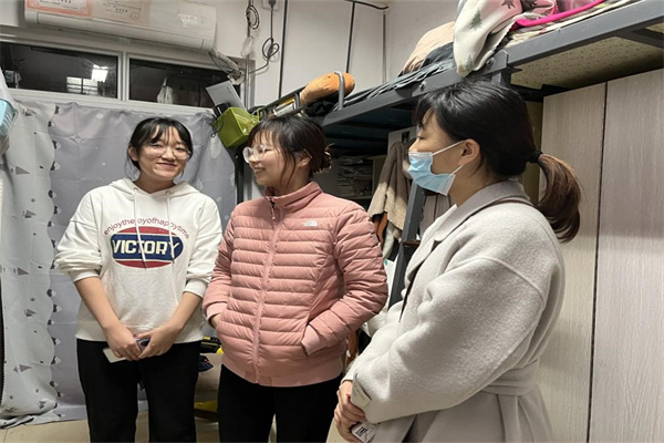 2018级辅导员罗静伟下寝慰问2018级本科生,对同学们的考研复试、就业及生活状况表示关心,并针对当前的疫情形势做出要求,她希望同学们能够积极配合公司及公司的防疫工作,提高安全防范意识,保障好自身的安全。