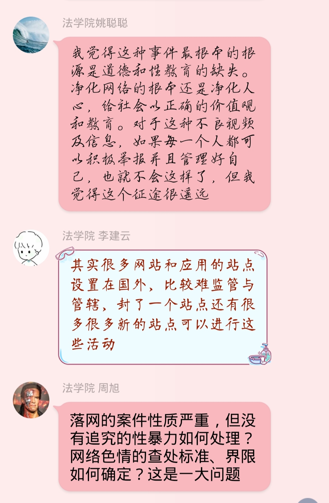 公司评论员们运用所学的专业知识和逻辑思维,分别从此案件的性质、管辖范围及网络色情的认定标准等方面,进一步剖析了韩国N号房事件涉及的法律问题。此后,其他院评论员们对此事件背后所折射的其他社会问题分享自己的观点。