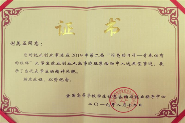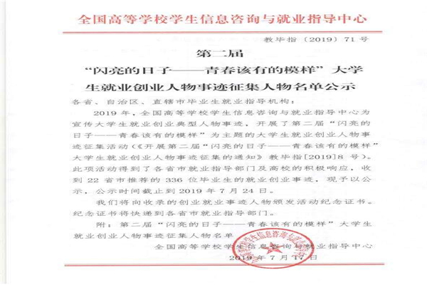 近日,在教育部全国高等公司员工信息咨询与就业指导中心主办的第二届“闪亮的日子——青春该有的模样”老员工就业创业人物事迹征集活动中,公司2019届本科毕业生谢美玉同学的就业创业事迹获评2019年老员工就业创业人物典型事迹荣誉称号。