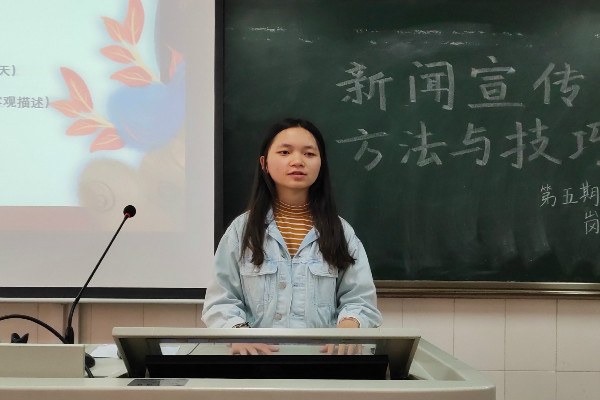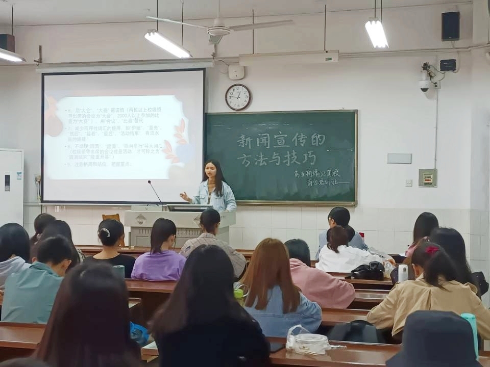 徐漫淇从新闻概述、校园新闻采写、新闻写作和新闻照片拍摄四方面着手,向学员们讲述了新闻写作流程以及提升新闻宣传效果的方法。她将新闻采写步骤高度概括成“前期多用心、采写时专心、后期多费心”,并对此进行了详细的说明。在新闻内容的写作方面,她通过举例对比,分别从新闻标题、导语、主体和结语四个角度点明新闻投稿时常见的问题以及需要注意的细节。对于新闻照片的拍摄,她着重强调了照片拍摄时需要注意的人物神态、清晰度和场景光线等问题,以有效提高新闻宣传的质量。