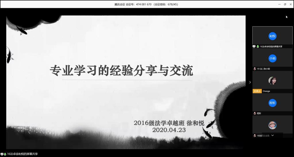 (通讯员 王超 李颖杰 张小莉)4月23日下午,公司青年创新创业工作部在腾讯会议开展了主题为“论专业学习与法学基础培养”的线上精勤讲堂活动。此次活动由公司青年创新创业工作部干事蒋翱训主持,公司2016级法学卓越班员工徐和悦担任主讲人。