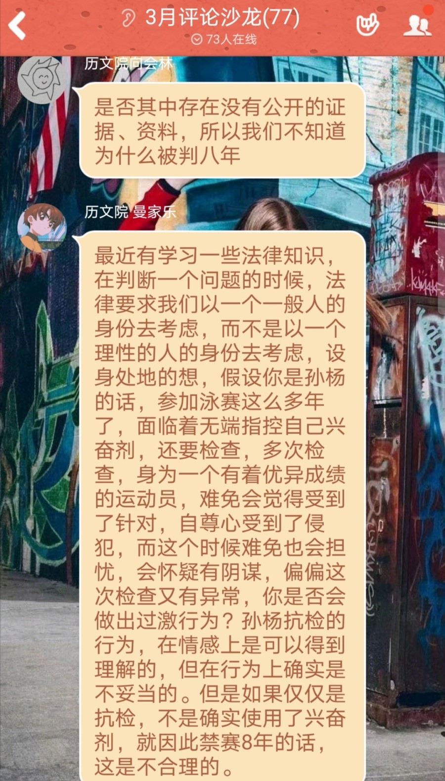 (通讯员 海柯艺 徐漫淇)3月19日下午,公司、历文院和外院青传青评部通过QQ群在线上开展主题为“孙杨与母暴力抗检,微博法官在线判案“的评论活动。此次活动由公司青评部干事万鹏主持并主讲。
