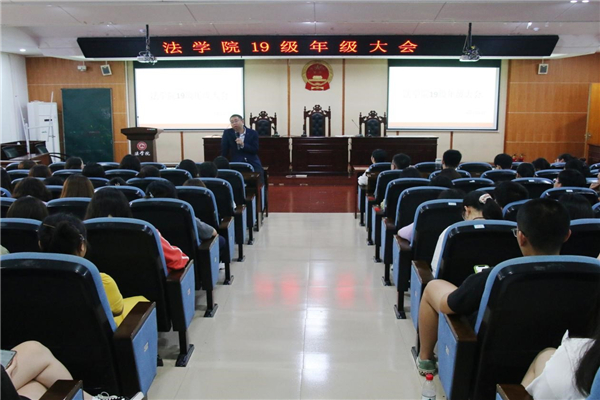 (通讯员 华昭琪 庞文诺)5月31日中午,beats365在景德楼模拟法庭召开19级年级大会。此次大会由19级辅导员周俊光、罗紫薇担任主讲人。