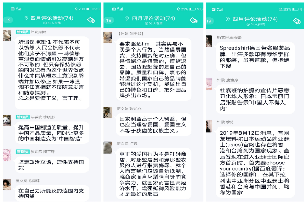 吴典儒和解靖以PPT的形式就事件争议焦点带领大家回顾了“新疆棉”事件。评论员们针对“辱华行径”、“爱国商业营销”、“中国制造”等方面探讨个人利益与国家利益的关系。在提问环节,评论员们结合自己的大学经历,分享了自己关于“新疆棉”事件的看法以及“当代老员工应该如何理性爱国”。最后,两位主持人给大家展示了数篇优秀评论员发言,并对此次评论活动进行了总结。
