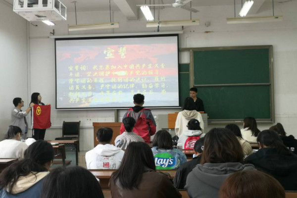 仪式开始,新团员奏唱团歌,面对团旗庄严宣誓。随后,罗静伟致辞,欢迎每一位加入中国共青团的新团员,并对每一位新团员发出号召,要求新团员进一步了解共青团,坚定中国共青团的理想信念。她还就学习和生活方面对新团员提出了期望与建议,鼓励新团员积极认真地学习法律知识,兼顾专业学习和团组织工作,保持共青团员的优秀品质,用实际行动为团组织增光添彩。