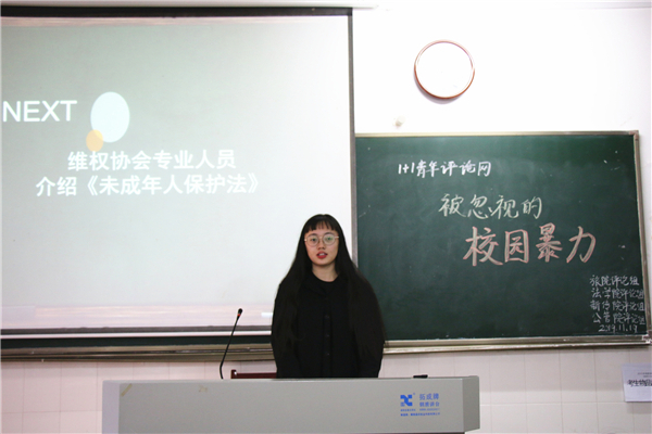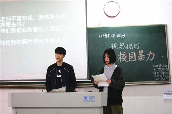 邹言瑞通过播放抵制校园暴力的公益短片,引出了此次评论活动的主题。评论员们分享了自己目睹或经历过的校园暴力,讲述了受害者的遭遇以及公司与家长的作为。评论员们从家庭、公司、社会三个方面展开讨论校园欺凌产生的原因。胡慧设置具体情境,提出了“若校园暴力发生在自己身上,该如何保护自身安全的问题”。评论员各抒己见,提出具体可行的应对方法。此后,beats365维权协会成员李珂向评论员们介绍了《未成年人保护法》的修改,评论员针对此法的修改发表各自的看法。