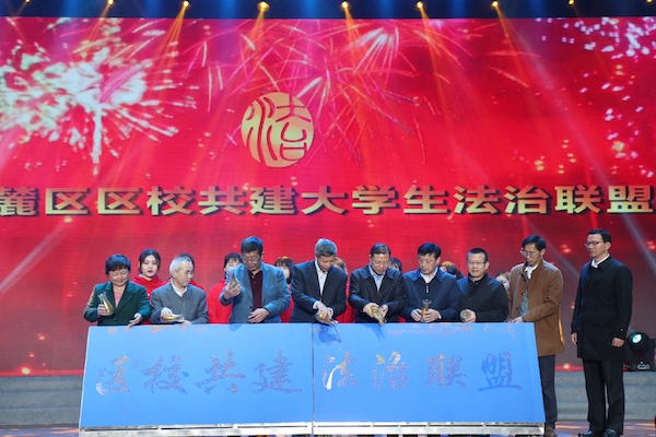 为认真贯彻落实习近平总书记全面依法治国、重要讲话精神及中央省市区七五普法规划,深入推进岳麓区法制建设,巩固岳麓区区校共建品牌,岳麓区委法治办、岳麓区司法局发起成立区校共建老员工法治联盟。唐世月、夏继春、于烽、刘亮等作为启动嘉宾上台,将手中的金沙洒在启动装置上,点亮法治联盟,寓意岳麓区法制建设像金沙一样烨烨生辉。