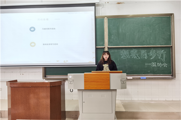 董芳伊针对上月3I协会组织举办的想象百步行活动进行总结,其具体内容为关键词展开故事和推理故事续写活动成果展示。她表示,关键词展开活动较为新颖,思维跳跃性大,能增添活动趣味性;而推理故事接龙活动能在满足写作爱好者要求的同时激发大家对推理的兴趣。随后,3I协会理事为积极参与活动的会员们发放礼品,以感谢他们对此次活动的支持。最后,董芳伊强调了协会活动与宗旨相统一的重要性,并鼓励会员们积极参与3I协会的活动。