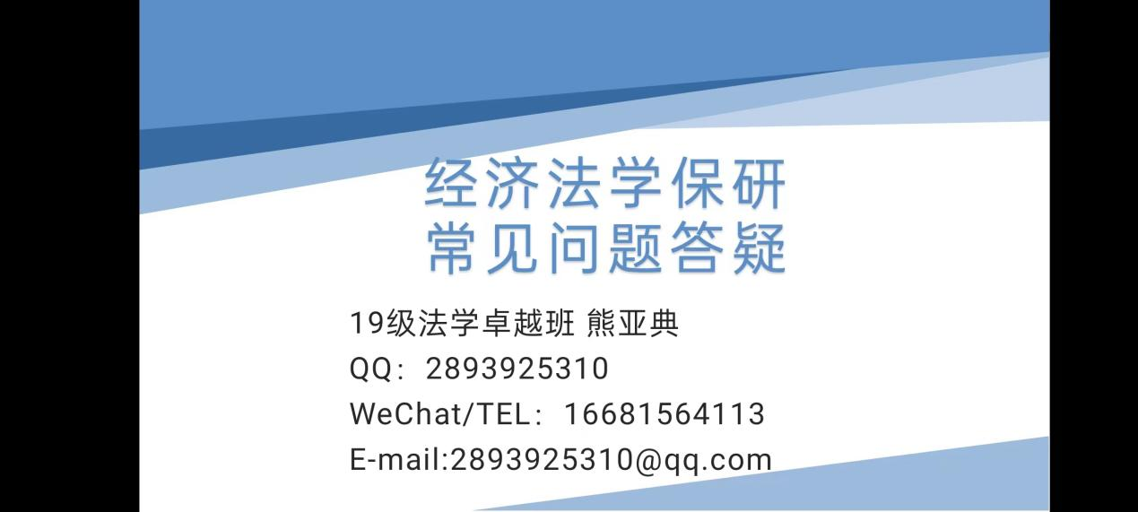 (通讯员 刘香钰 何思雨 侯辰霖)11月18日中午,公司团委创新创业工作部在线上举办了“经济法学保研常见问题答疑”精勤讲堂。2019级法学卓越班熊亚典担任主讲人。