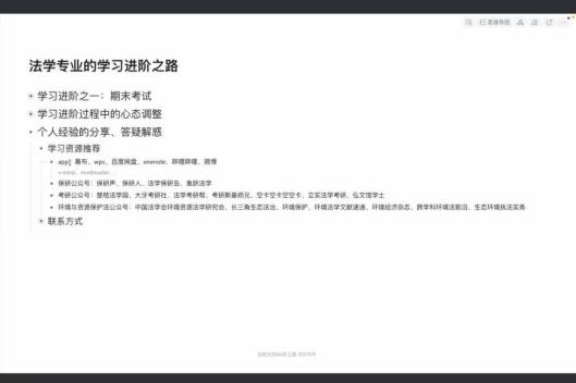 姜滔从期末考试相关问题着手,为同学们讲解了期末考试的一般要求,分享了复习方法,并提出了期末考试的备考建议;他介绍了进阶学习中的心态调整:要正确认识自己的学习目标,切忌给自己盲目施压;同时分享了两位同学的学习经验,向同学们推荐了一些优质的软件以及获取相关知识的公众号,并且解答了同学们有关法考的问题。