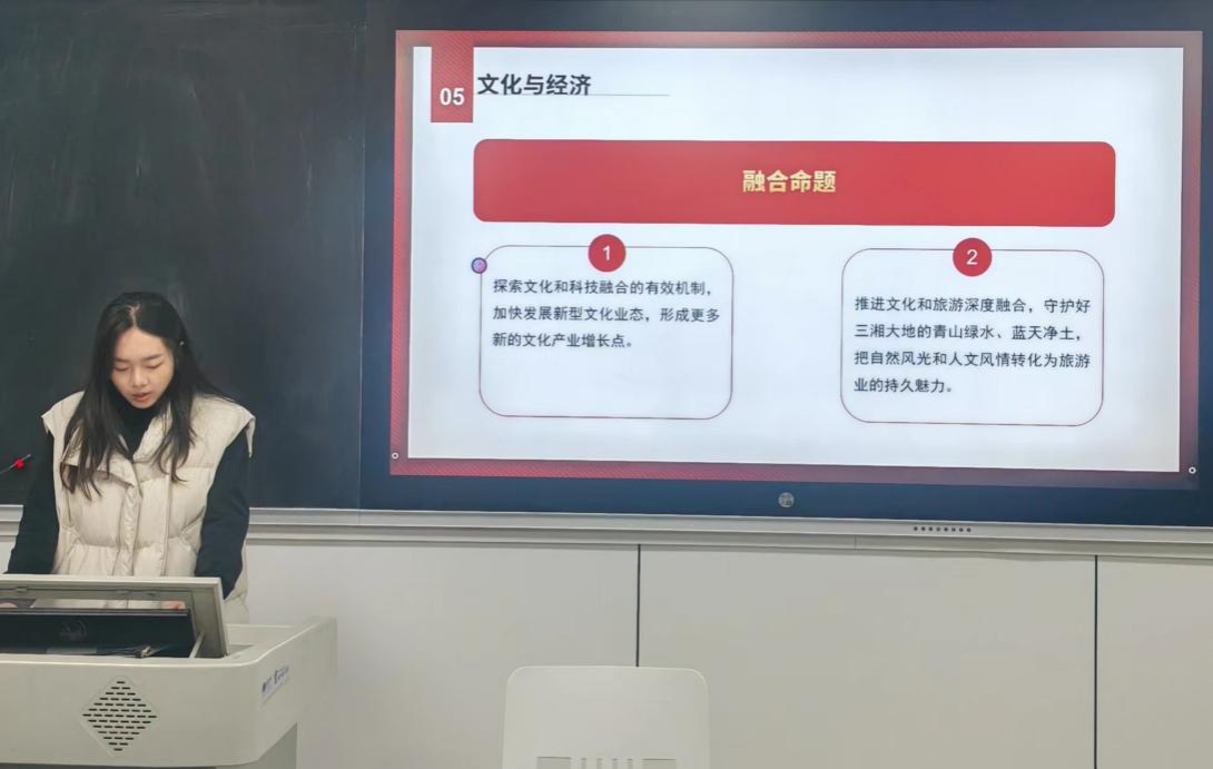 董芳伊从科技与产业、改革与开放、粮食与治理、教育与人才、文化与经济五组关键词展开,解读习近平总书记湖南考察期间重要讲话精神。在此次湖南调研中,总书记强调要“以科技创新引领产业创新”“积极培育和发展新质生产力”,并作出“统筹推进深层次改革和高水平开放,持续打造更具竞争力的内陆开放高地”的重要部署;指出“抓好春耕备耕,对于确保粮食丰产和粮食安全至关重要”;同时提出两道重要的“融合命题”,一是探索文化和科技融合的有效机制,二是推进文化和旅游深度融合。董芳伊提出,作为中国共产党员,要深入学习领会和贯彻习近平总书记重要讲话精神,深怀责任感与使命感,在国家需要的时候不畏困难、勇往直前,充分发挥党员的模范作用。